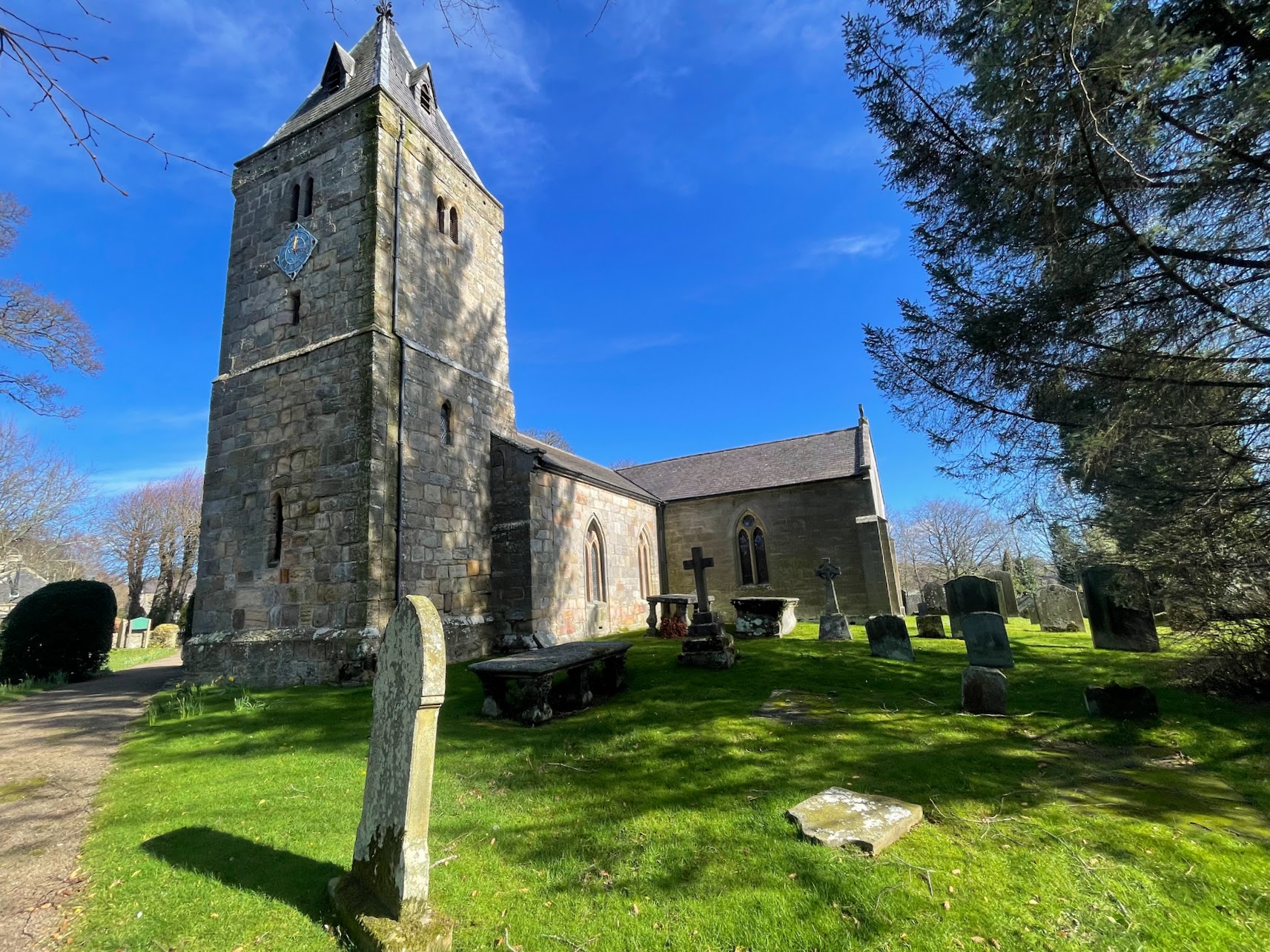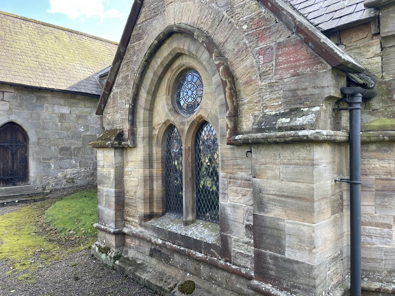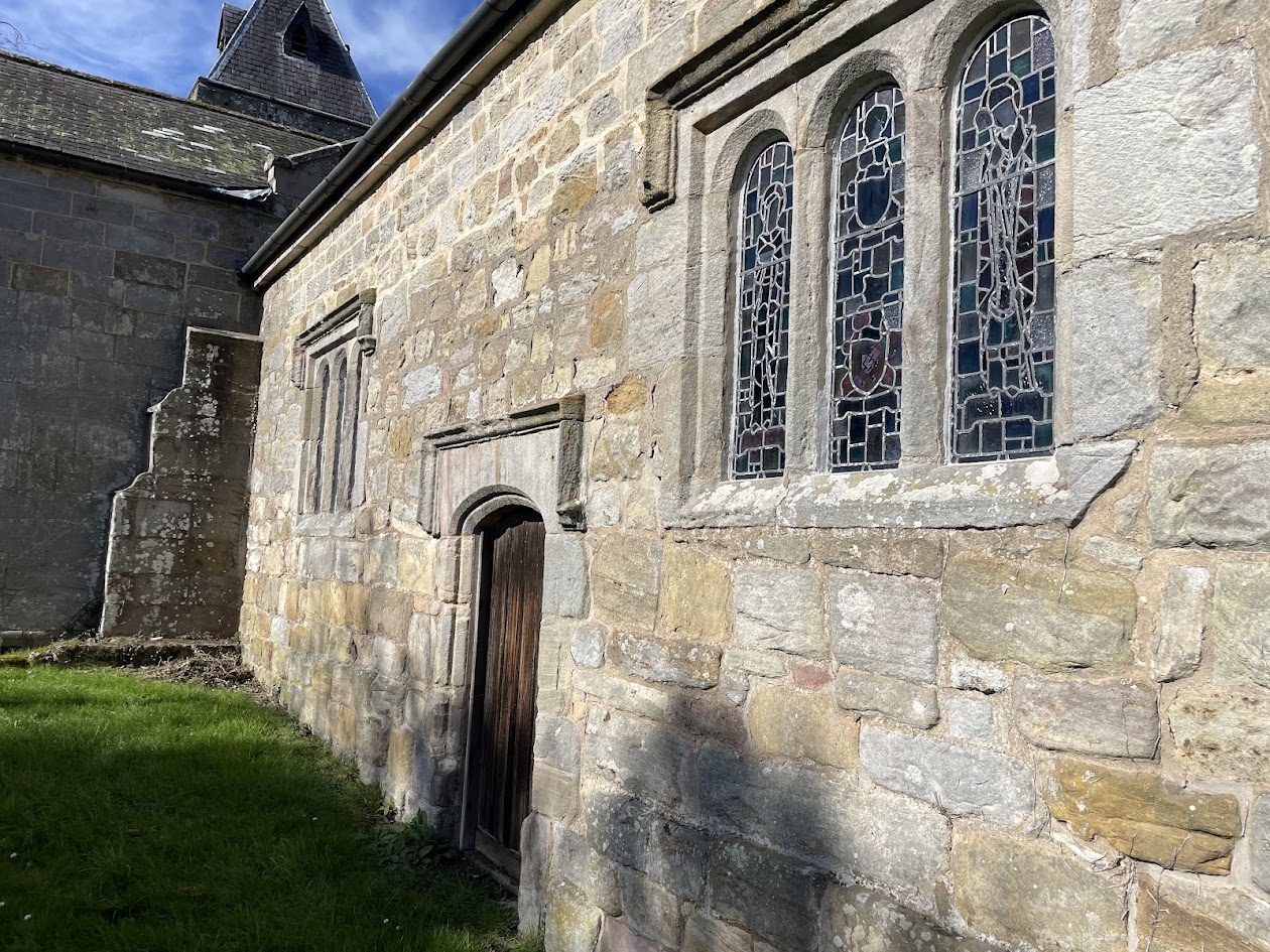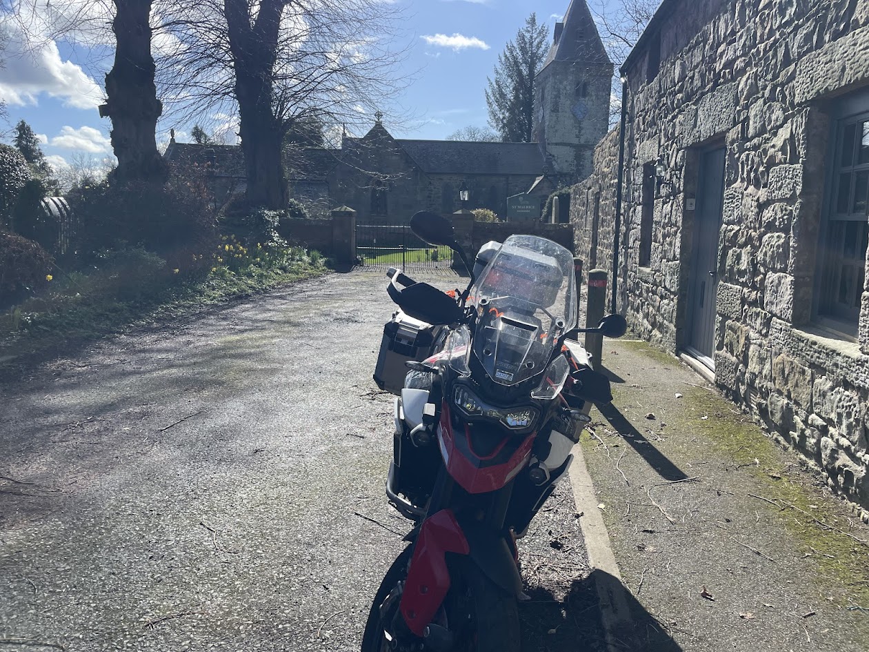 Once parked up and with the engine silenced and helmet off, I took a few moments in the sun and noticed just how pleasant and loud the birds were here - a symphony of Spring energy. The grounds and church are very picturesque, especially in the brilliant sunshine. As is fairly common, the buildings and windows have been replaced and augmented several times over the centuries. This church was virtually destroyed in 1640 at the hands of an army called the "Covenanters" who had signed covenants to uphold Presbyterian rule over Anglican. Another religious war.