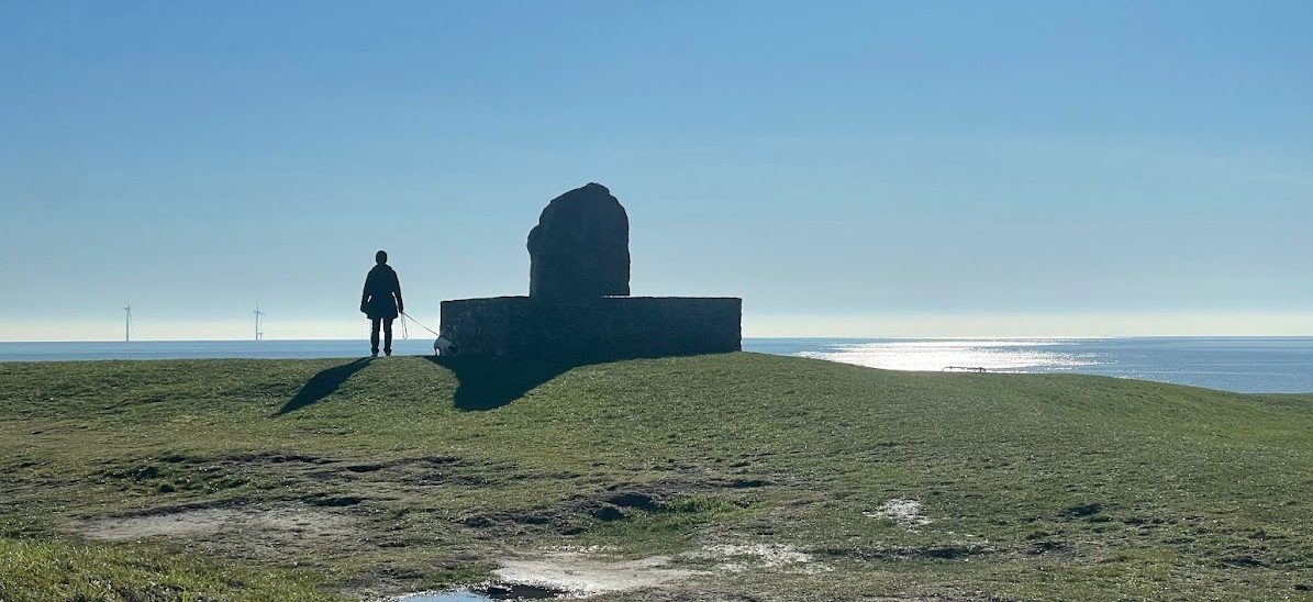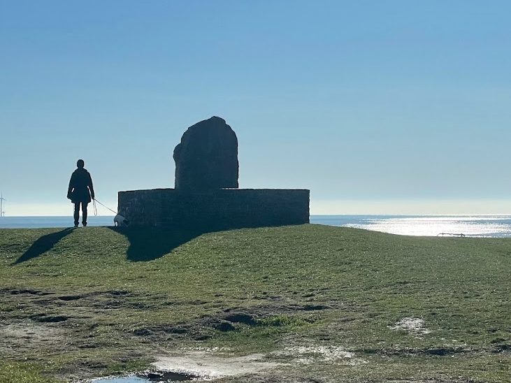 My eyes were immediately drawn to a dog walker in silhouette standing next to a large stone, a marker for the location of a time capsule, buried as part of millennium celebrations during 2000. A simple but powerful composition.