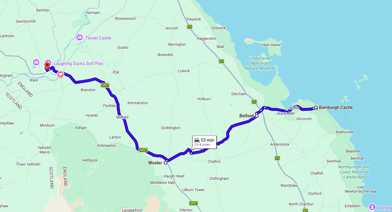 After a leisurely ride up the coastal road and a brief stop at Bamburgh, which is well worth a visit if for nothing else than one of the best beaches in Northumberland, I headed West and further North into the Scottish Borders. I took the Belford road on this occasion to bridge across to the main A697 North. Belford is an interesting market village and used to serve as a significant coaching stop - but not for this coach on this occasion as I pass through on my way to Wooler. It would make a good place to stay for exploring North Northumberland and the adjacent coastline.