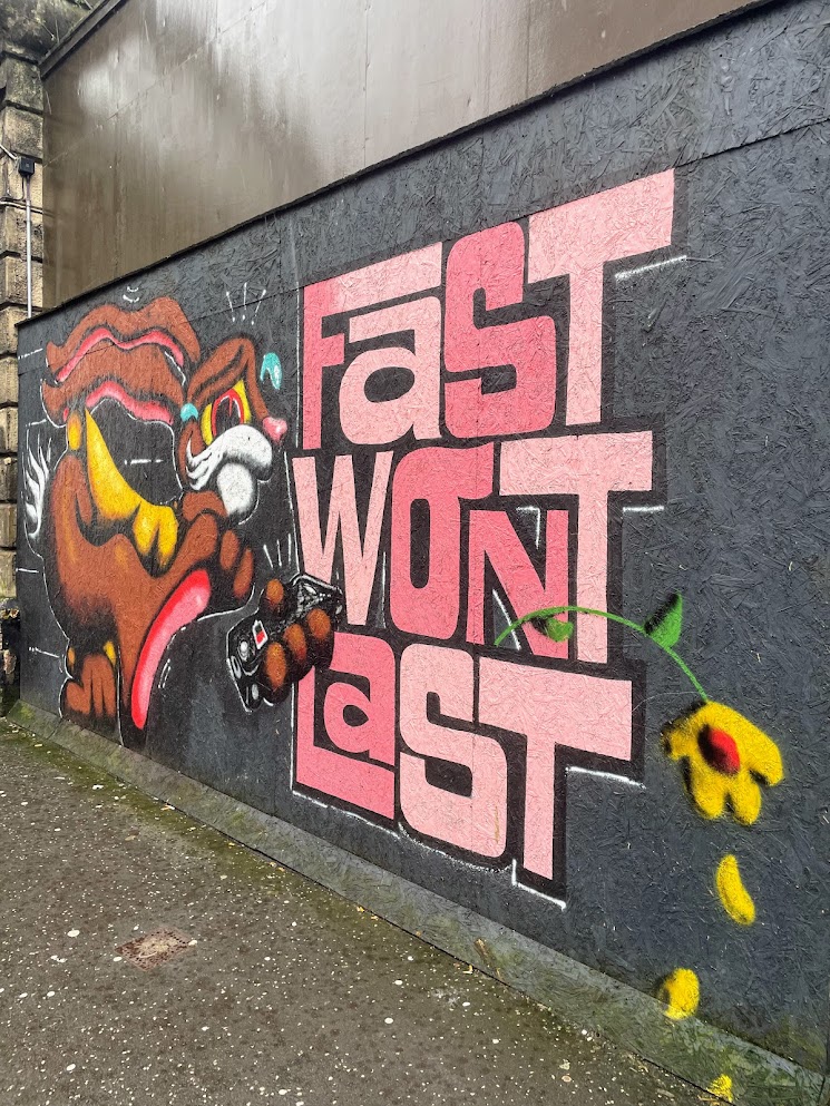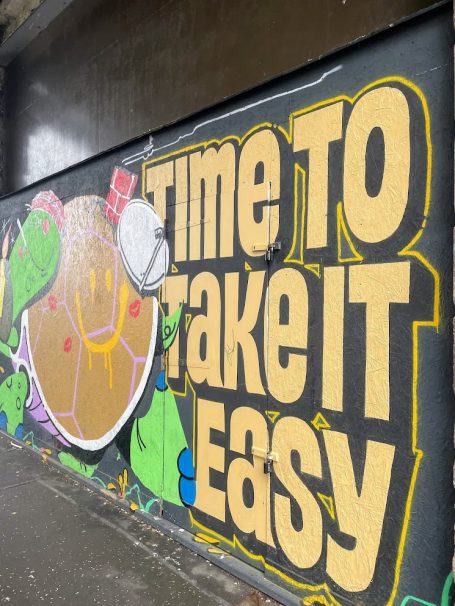 The billboard sized graffiti declaring “time to take it easy” and “fast won’t last” serve as a bold, in your face, reminder that life is best savoured in stages, not rushed as if in a competition or a race.