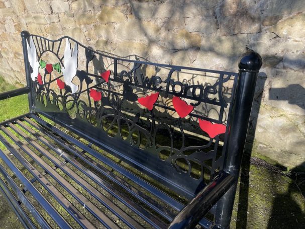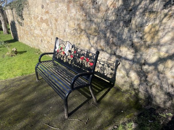 I found a wonderful memorial bench to enjoy the snack. Emblazoned with white doves, red poppies and the words "Lest We Forget", casting a clear shadow on the stone wall behind.