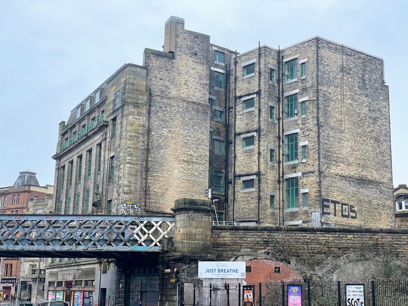 The Templeton Building, inspired by Venice’s Palazzo Ducale, was created by business James Templeton and Son, to host the weaving of Templeton's patented spool Axminister carpets. When original designs were rejected by the Glasgow Corporation, Templeton hired a top architect William Leiper to create a design modelled in the venetian-gothic style which could not possibly be rejected. During construction the main facade collapsed due to winds and insecure fixings, killing 29 women in weaving sheds below. After completion in 1892, and some years of business as usual, a fire broke out in 1900 resulting in further deaths, commemorated by a statue on top of the main facade (seen in the last photo above). Despite collapse and fire, the business continued to flourish, displaying strength and possibilities, evolving in ways that were always latent within it. During the 1980s, the business merged with another and the building was re-purposed as a business centre (1984). Re-generation starting in 2005 re-purposed the building again into mixed use - apartments, office space and the West brewery, bar and restaurant. One facade, multiple purposes over time.